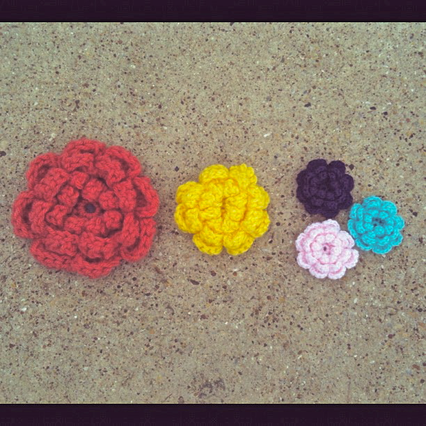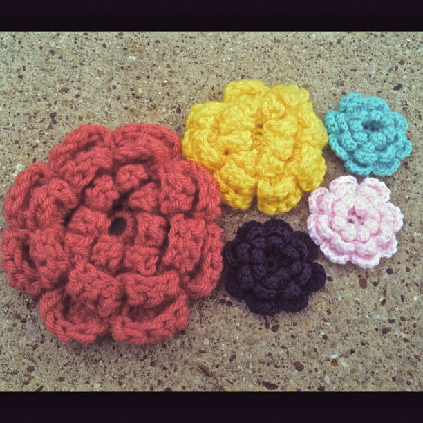 Love your little flowers in different sizes. My kids have got me crocheting a shabby chic white ghan with mauve, pink and green pastel colored yarn in my spare time, only a 3rd of the way through though, then I still have to put flowers and butterflies on it.