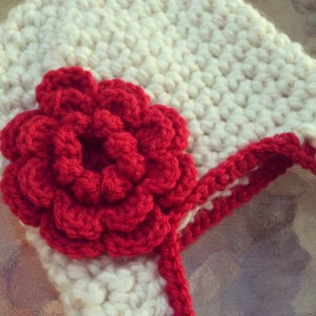 The hat is a soft, plush off-white yarn. The flower and edging is coral.