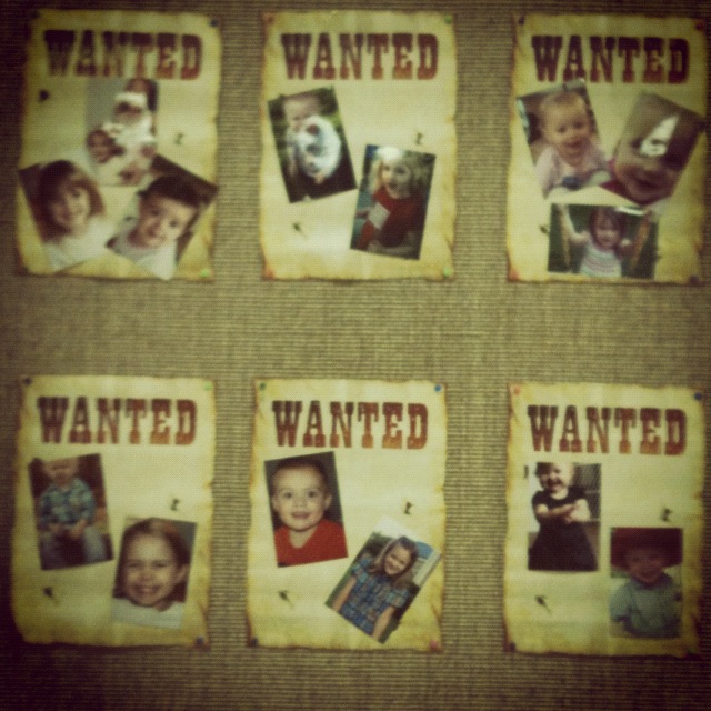 Wanted posters with pictures of the guests (the toddler is on the bottom right poster in the bottom right of the picture)