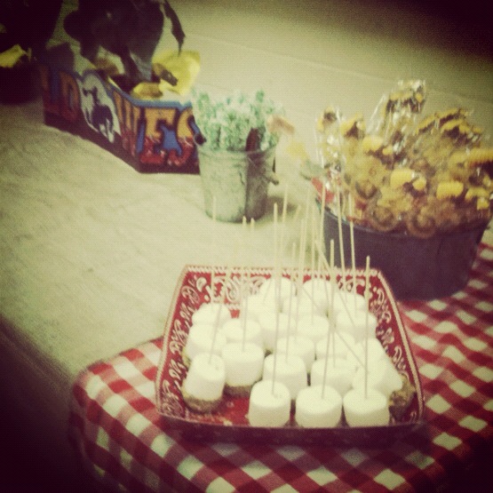 The dessert table before she brought out the cupcakes. There are pretzels dipped in chocolate and coconut, cowboy suckers (with boots and stars), and giant marshmallows dipped in chocolate and graham crackers.