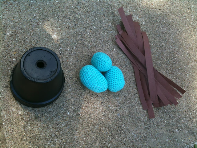 I used the crochet egg pattern from Lion Brand yarn and I got the idea to paint a pot with chalkboard paint (although since I had chalkboard spray paint I just ended up spraying the entire pot).