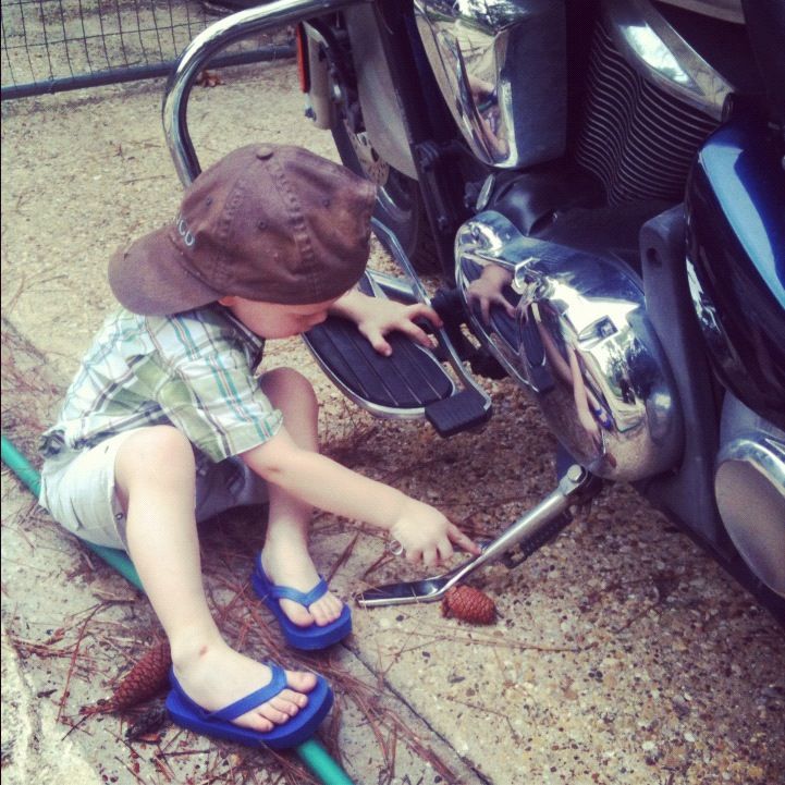 A couple of weeks ago my husband was outside working on his motorcycle. The toddler very much wants to be just like this Daddy. So he went and put his hat on, grabbed a wrench, and went outside to help.