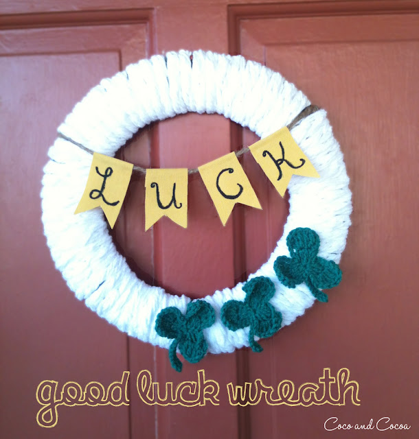 For my St. Patrick’s Day wreath I just had to change out a few things from my Valentine’s Day wreath. I left the white finger knit base, and just removed the hearts and ‘love’ banner.