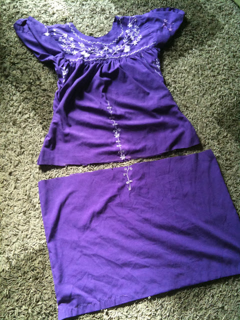 Several weeks ago I saw a Muumuu refashion project. Yep, a muumuu. And it was really cute! I have many memories of my grandmother wearing her muumuu’s around the house. I was pretty sure she had several, but when we were going through her closet I could only find this purple one. But I liked the detail around the neckline so I thought I’d give it a try.