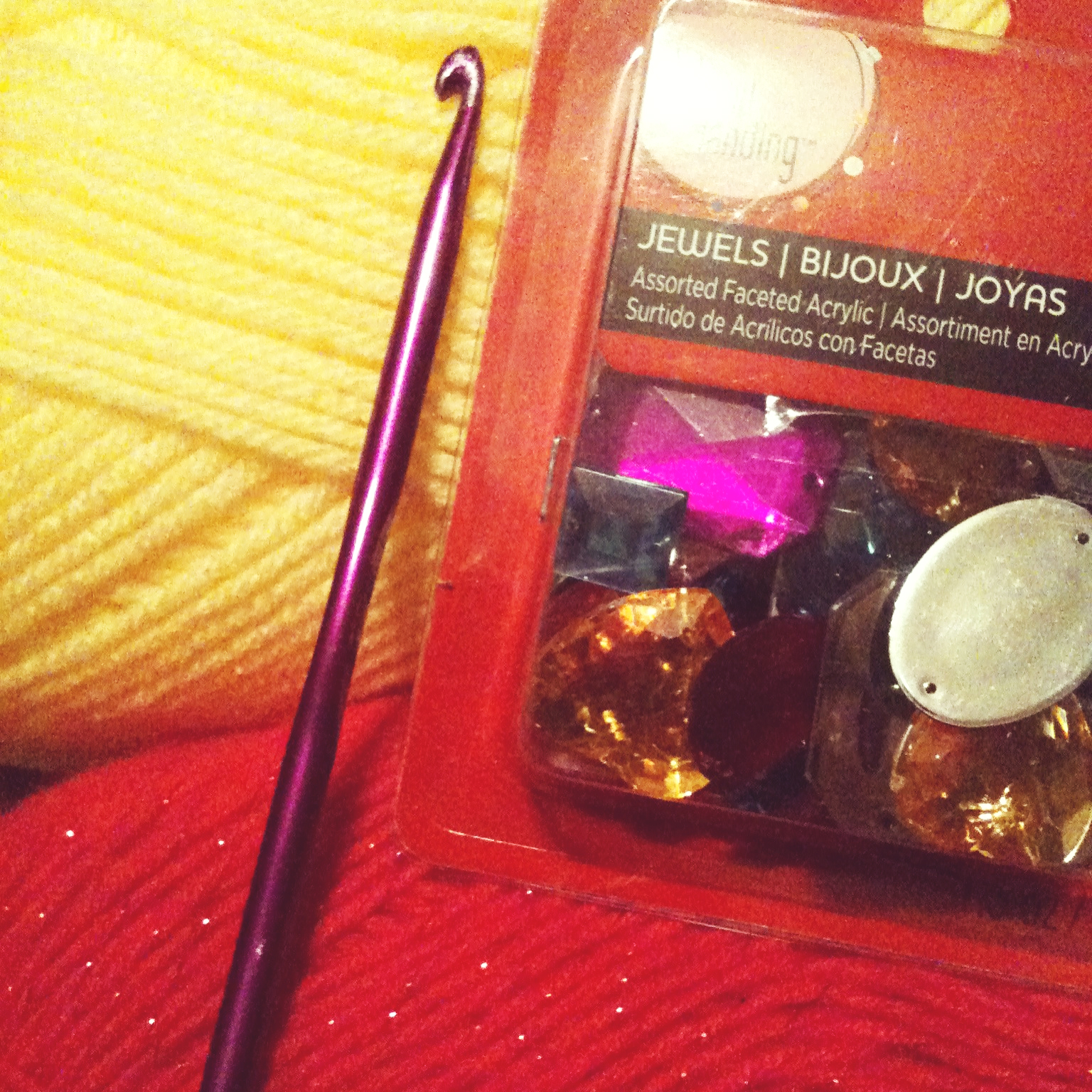 I also went to the store and got some supplies for my next crochet project. That’s a skein of yellow and pink (that has a glittery thread running through it) plus some jewels to stitch on. I can’t wait to show it to you when it’s finished.