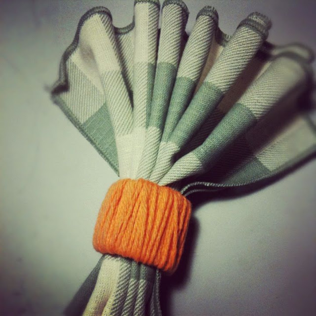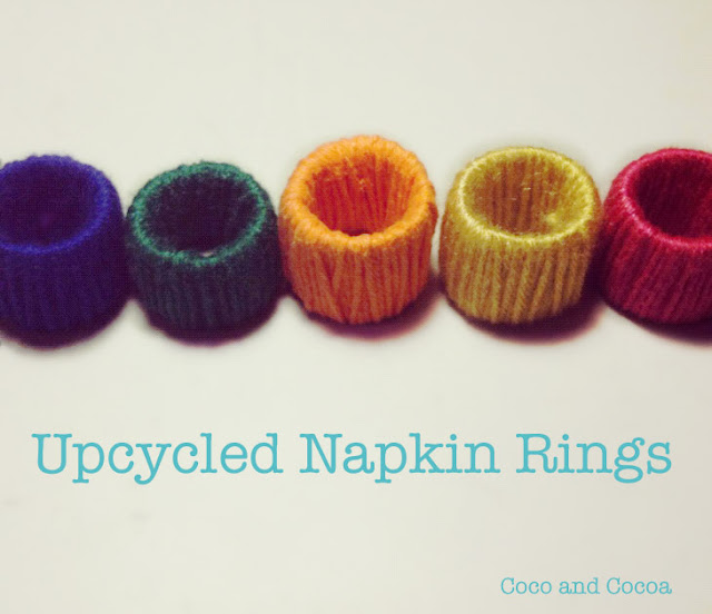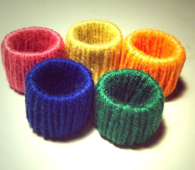 I went through my yarn scrap stash and grabbed the five smallest balls of yarn. Then I started wrapping the yarn around each plastic ring. I went around a couple of times and tucked the tail in when I was finished.