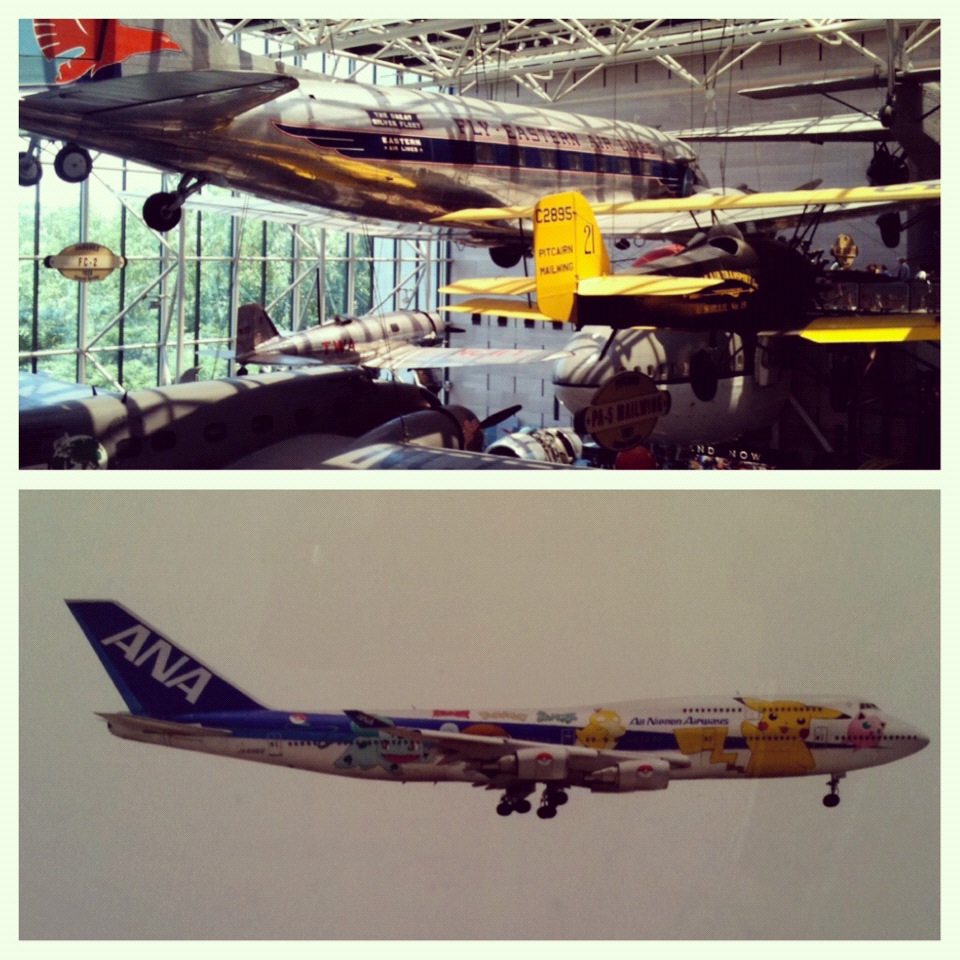 They were impressed with the full size planes hanging from the ceiling. They also really liked this picture of a plane painted with Pokemon characters.